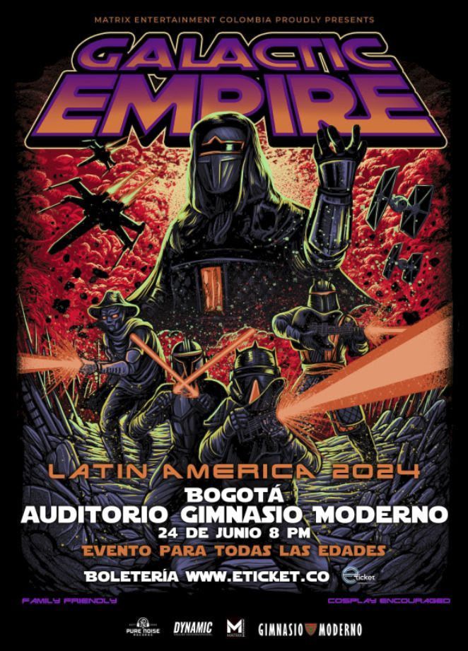 Con un nuevo álbum lanzado en el año 2023, 'Special Edition', la flota de Galactic Empire desembarca en Bogotá el próximo 24 de junio con la intención de conquistar la ciudad, con un espectáculo para toda la familia en el que el cosplay es casi un deber. ¡Que la Fuerza te acompañe!" Galactic Empire es una banda de metal con una característica pintoresca: todos los músicos son personajes del universo Star Wars. Pero del lado Oscuro, como corresponde. Así podemos ver a Darth Vader en la guitarra líder o a Boba Fett detrás de la batería.