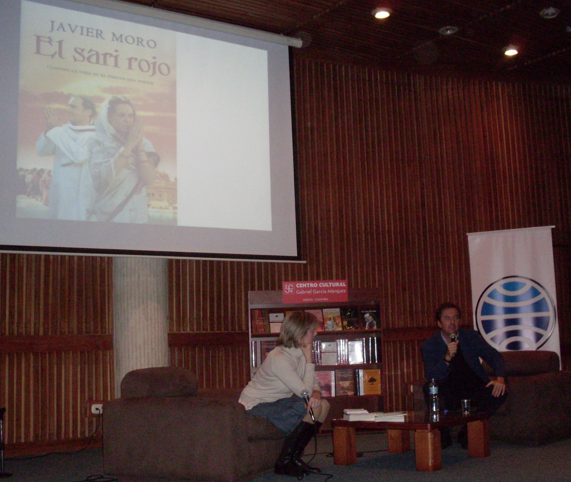 Un aplauso al unísono le daba la bienvenida al autor español mientras entraba en el auditorio. Cuando la presentadora del evento le sugirió sentarse para la exposición, con su sencilla personalidad le dijo que no, JM quiso dirigirse al público de pie y de esta manera se dio inicio a una tertulia literaria, en la que Moro nos explicó, apoyado con algunas fotografías, cuál había sido el proceso de elaboración de ‘El sari rojo’ y cómo fue su trabajo de investigación y documentación para poder escribir esta historia real, a modo de novela.