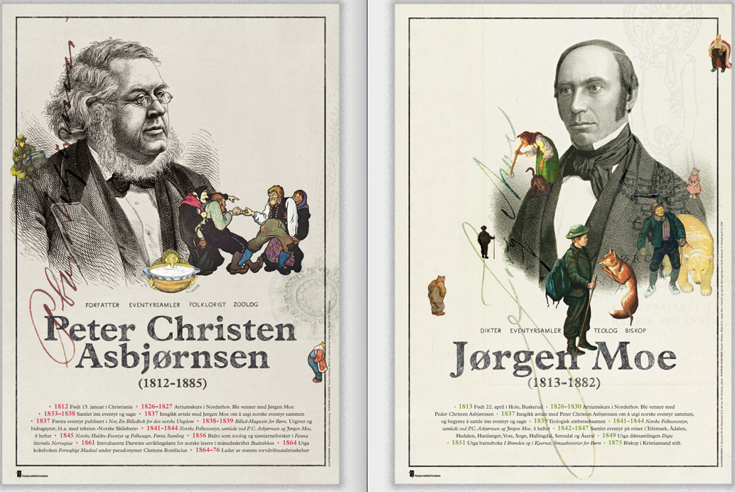 Peter Asbjørnsen nació en Christiania, la actual Oslo, en 1812 y Jørgen Moe en un pueblo cercano, en 1813. Fueron dos amigos que en la primera mitad del siglo XIX recorrieron a pie los campos de un país que todavía no era país, porque formaba parte de la corona de Suecia. En sus viajes escucharon más de un centenar de cuentos en una lengua que no se escribía porque la lengua de la cultura era el sueco. Pero ellos transcribieron estos cuentos que las gentes campesinas les contaron y los publicaron en diversas recopilaciones entre 1840 y 1870.
