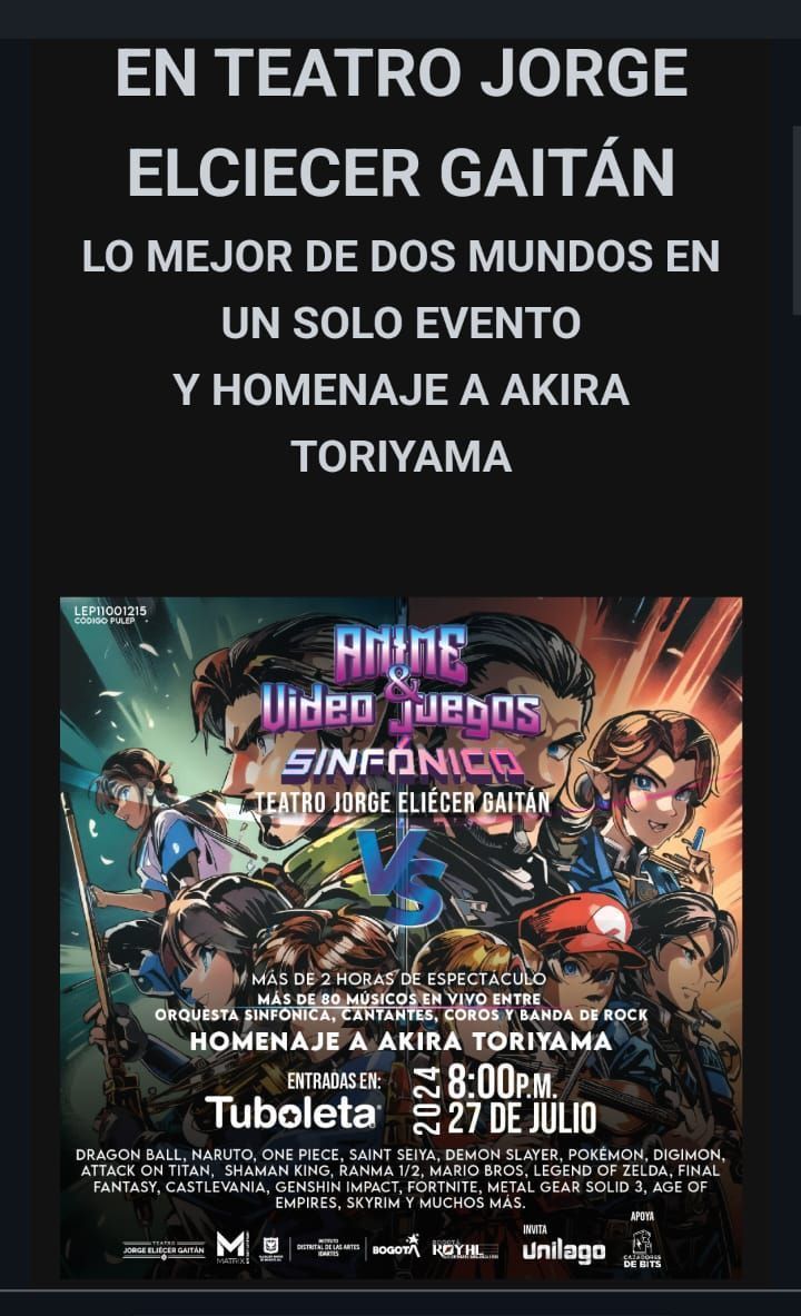 Con un homenaje al desaparecido creador de Dragon Ball, Akira Toriyama, y la puesta escena de las bandas sonoras de las series afamadas de animé, o animación japonesa, este 27 de julio, el Teatro Jorge Eliécer Gaitán, De Bogotá, será el epicentro de una fiesta musical y artística