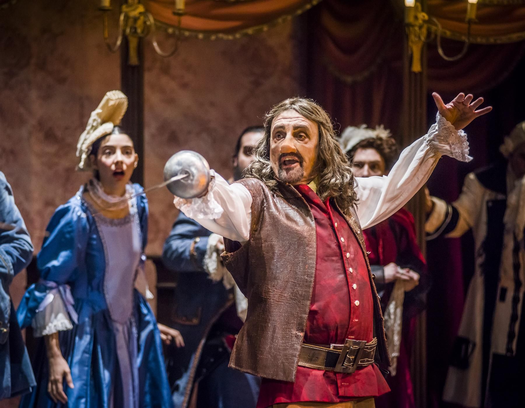 Un contexto que enmarcó la obra de Edmond Rostand, Cyrano, y que ha sido adaptada al cine y al teatro infinidad de veces, cada una con su toque regionalista y visión de autor. Una de estas miradas se exhibe en el Complejo Teatral San Martín, de Buenos Aires.