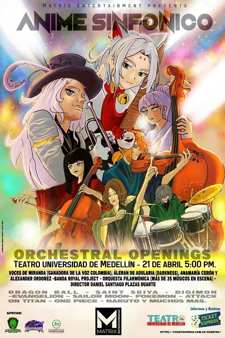 Luego de Bogotá, llega a Medellín el Animé Sinfónico “Orchestal Openings”, canciones que nos llevarán a aquellas series japonesas inolvidables para generaciones. Temas de series como Dragon Ball, Saint Seiya, Digimon, Pokémon, Evangelion, Sailor Moon y muchos más, harán vibrar junto a La Orquesta Sinfónica del Valle de Aburrá acompañados con más de 35 músicos en escena, las voces de la cantante antioqueña Miranda (primera ganadora de La Voz Colombia) y Áleran de Adularia (Darknees), Ana María Cerón y Alexander Ordoñez (Rojal Proyect- Banda de Rock) dirigido por Daniel Santiago Plazas Duarte.