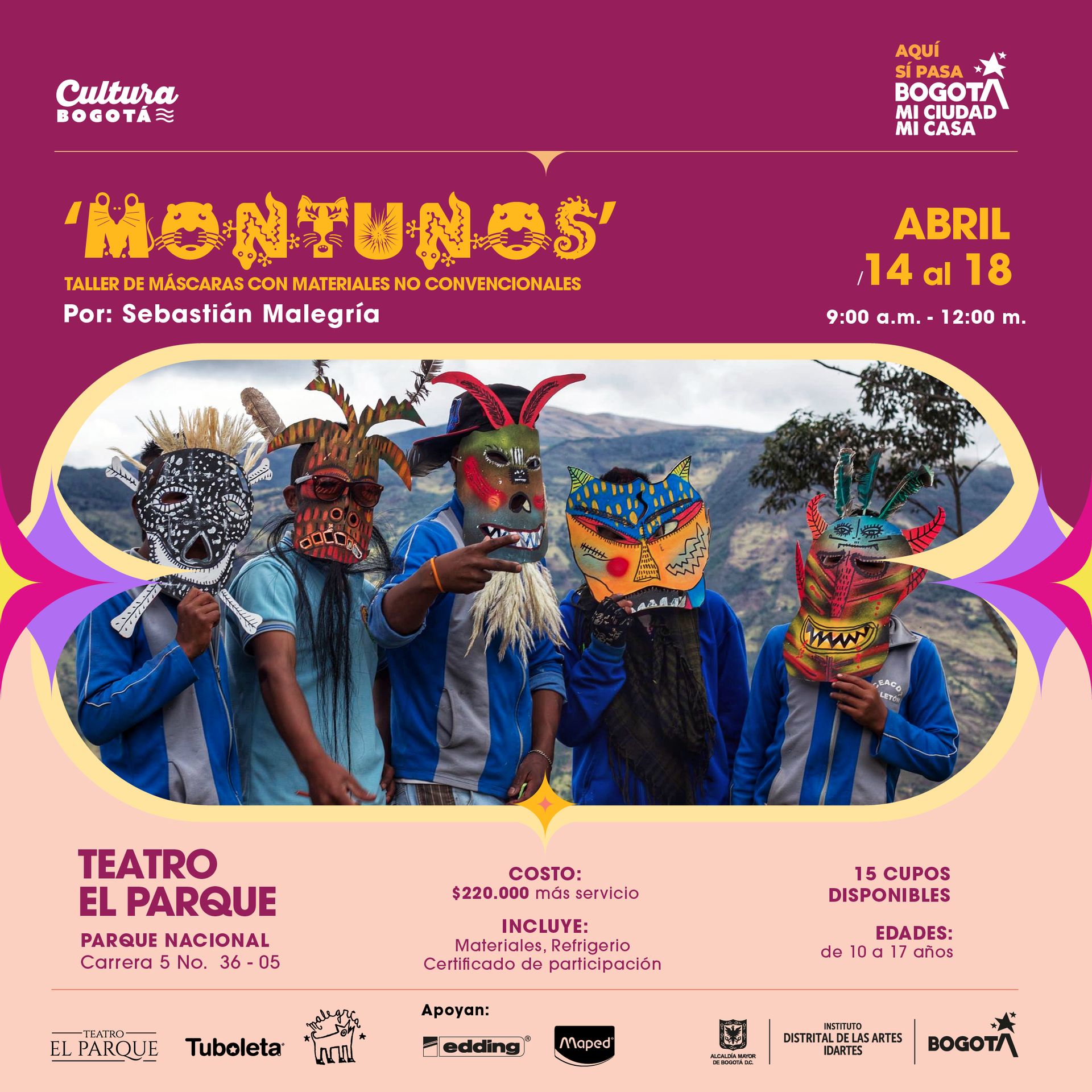 Este es un taller que invita a los participantes a crear máscaras, utilizando elementos no convencionales, integrando materiales del entorno cotidiano y de la naturaleza circundante a los cerros orientales de Bogotá, cerca del Teatro al Parque. Será del 14 al 18 de abril, de 9:00 a. m. a 12:00 m.